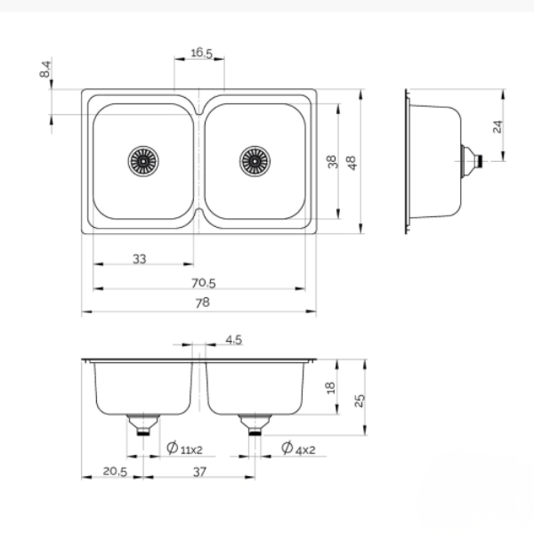 ARIEL PILETA ACERO DOBLE 78 X 48 X 8 CM