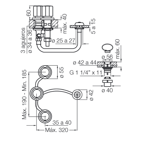 | Caudal | Caudal mínimo de salida a presión estática requerida de 0.4 BAR y caudal mínimo de alimentación de 20 lts por minuto (en conexiones fría y caliente): 4,5 lts por minuto. |
