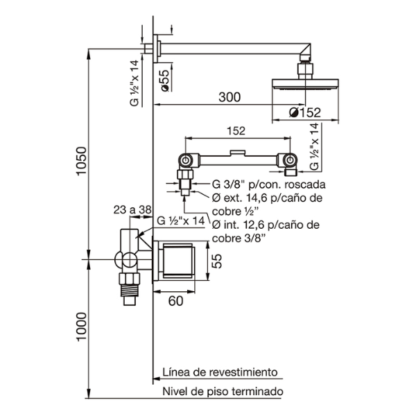 | Caudal | Caudal mínimo de salida a presión estática requerida de 0,4 BAR y caudal mínimo de alimentación de 20 lts por minuto: Por ducha 6,5 lts por minuto. |